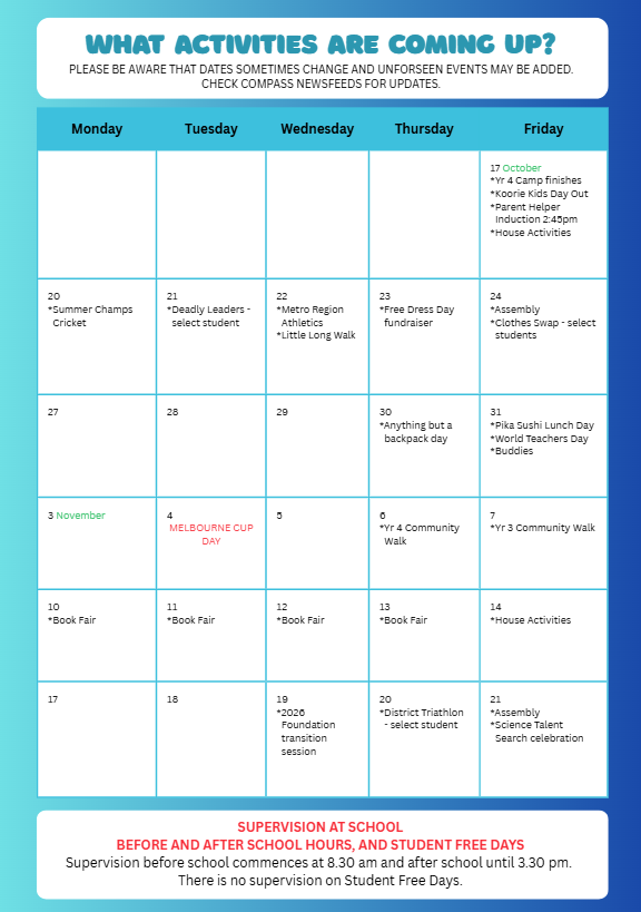 Welcome back for Term 4. We have had a wonderful beginning to the term with all classes getting straight into learning. Some highlights from my recent classroom walkthroughs included seeing our Foundation students learning about narrative writing and our Year 2 students learning about fractions. I also received some very thoughtful letters from some of our Year 5 students who shared with me some of the happenings from their school holiday break. I look forward to responding to these students soon.