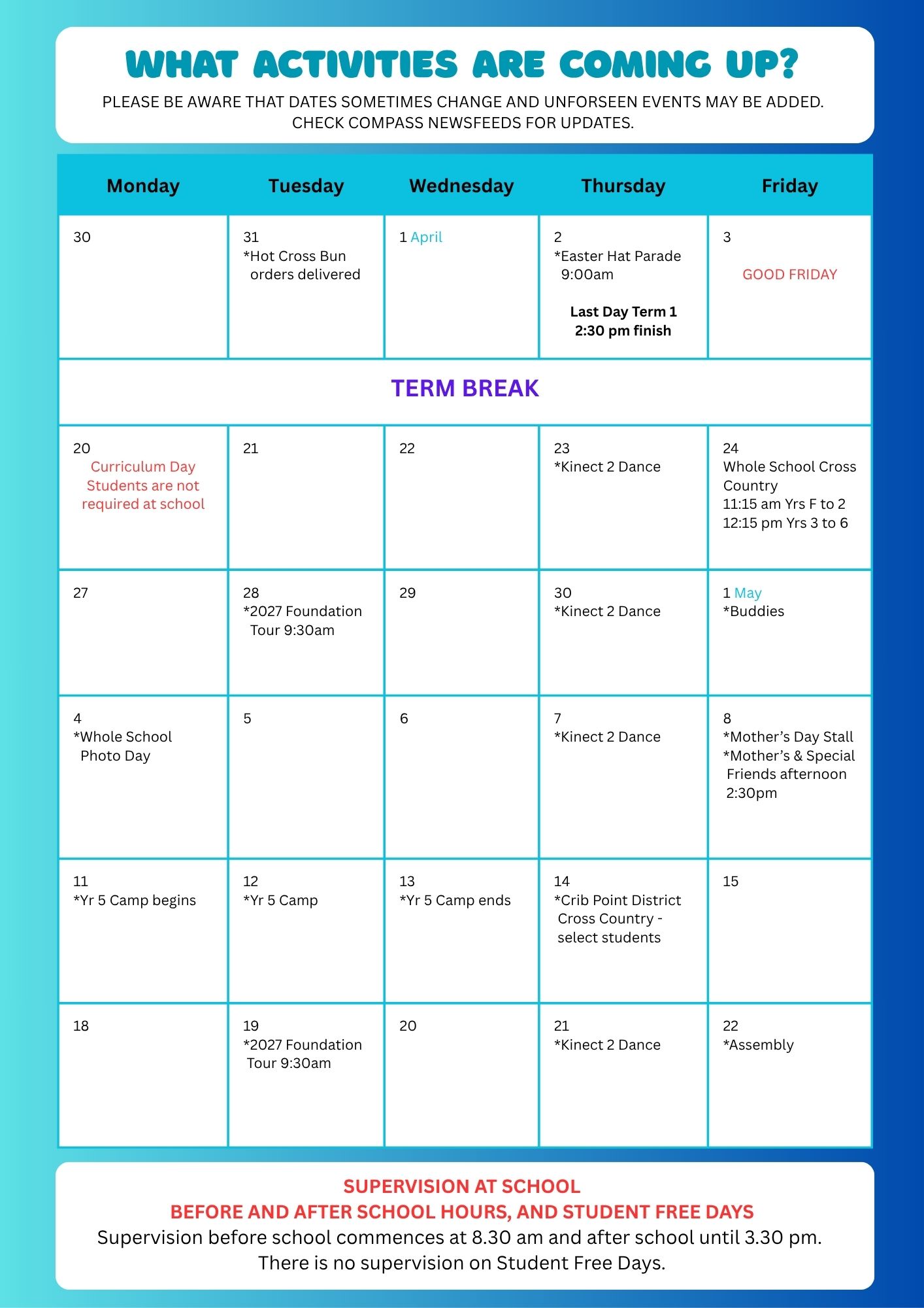 There is no supervision on Student Free Days.